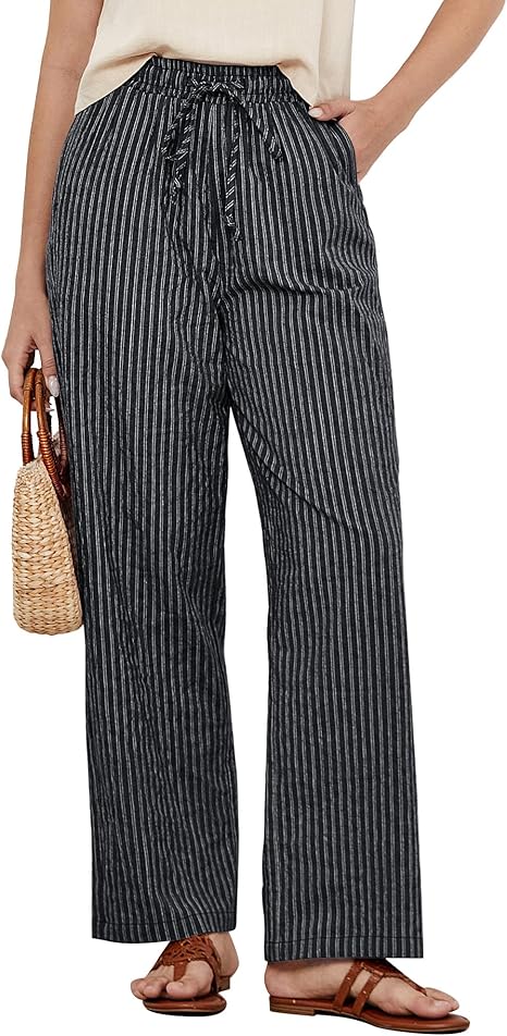 - These women's cotton trousers feature an elastic waistband and drawstring for comfort, style, and elegance.